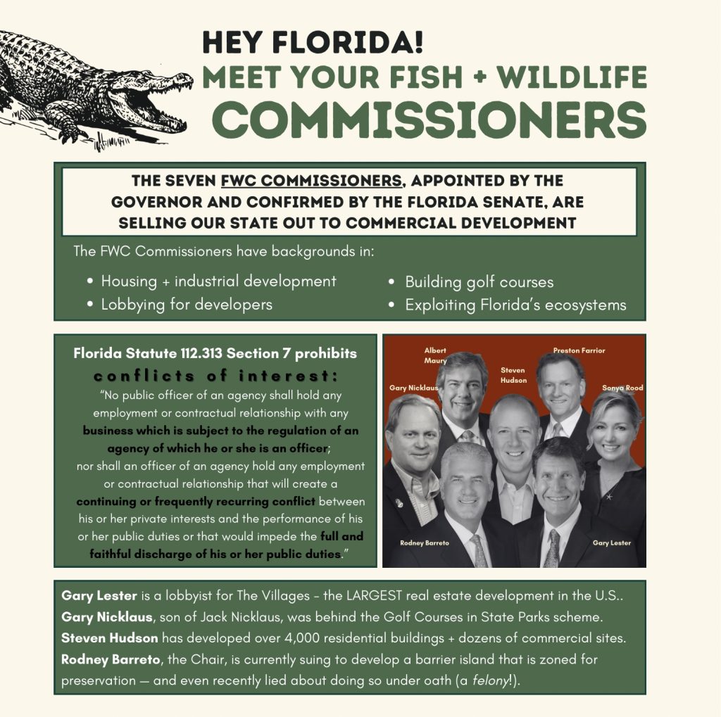 The seven FWC Commissioners, appointed by the Governor and confirmed by the Florida Senate, are selling our state out to commercial development.